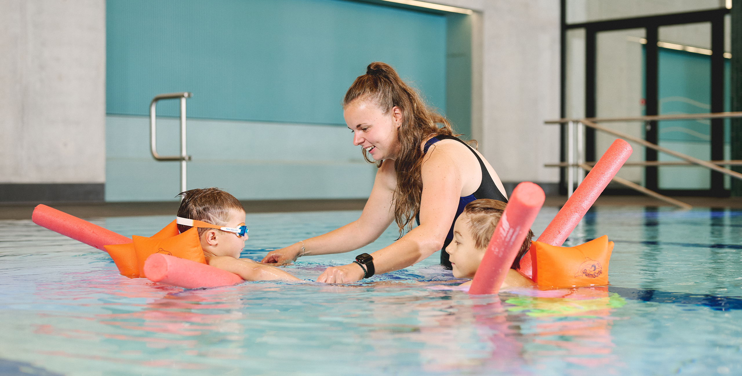 Kursleiterin mit zwei Jungen, die mit Schwimmflügeln und Schwimmnudeln schwimmen lernen
